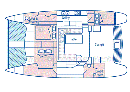 Featuring 3 double cabins and 2 ensuites, this is an ideal catamaran for a group of friends or a family due to the privacy offered by the location of each cabin. With the galley located in the starboard hull, this allows the saloon in the centre of the main cabin to be larger than what you'd expect to find on a vessel this size.